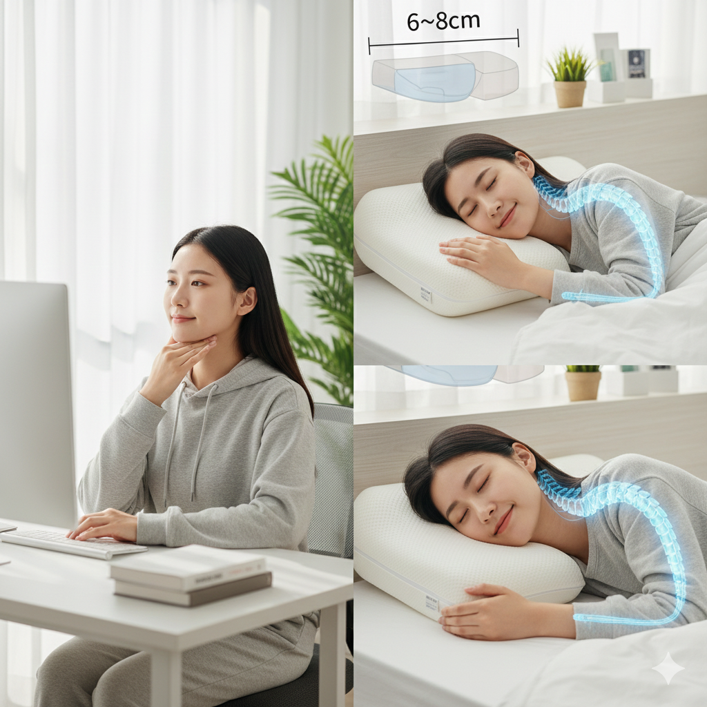 정면을 보고 누웠을 때 베개 높이는 바닥에서 6~8cm가 적당하며, 목뼈의 C자 곡선을 지지해줘야 합니다.