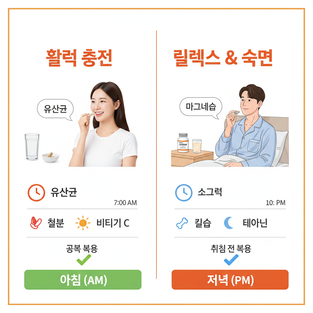 | 아침 식후 | 비타민 B군, 종합비타민 | 식사 직후 15분 이내 | 에너지 대사 활성화 및 위장 보호 |